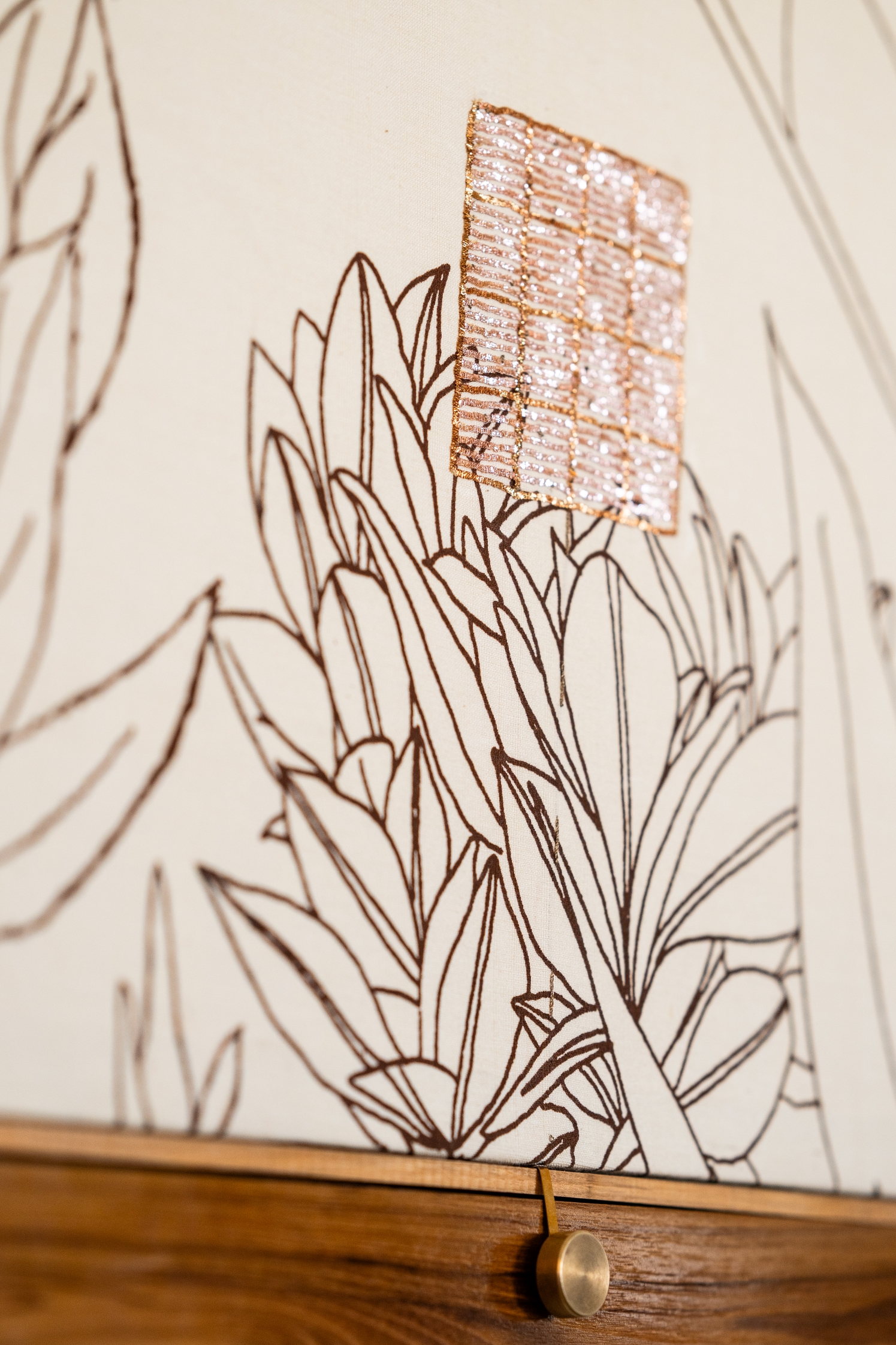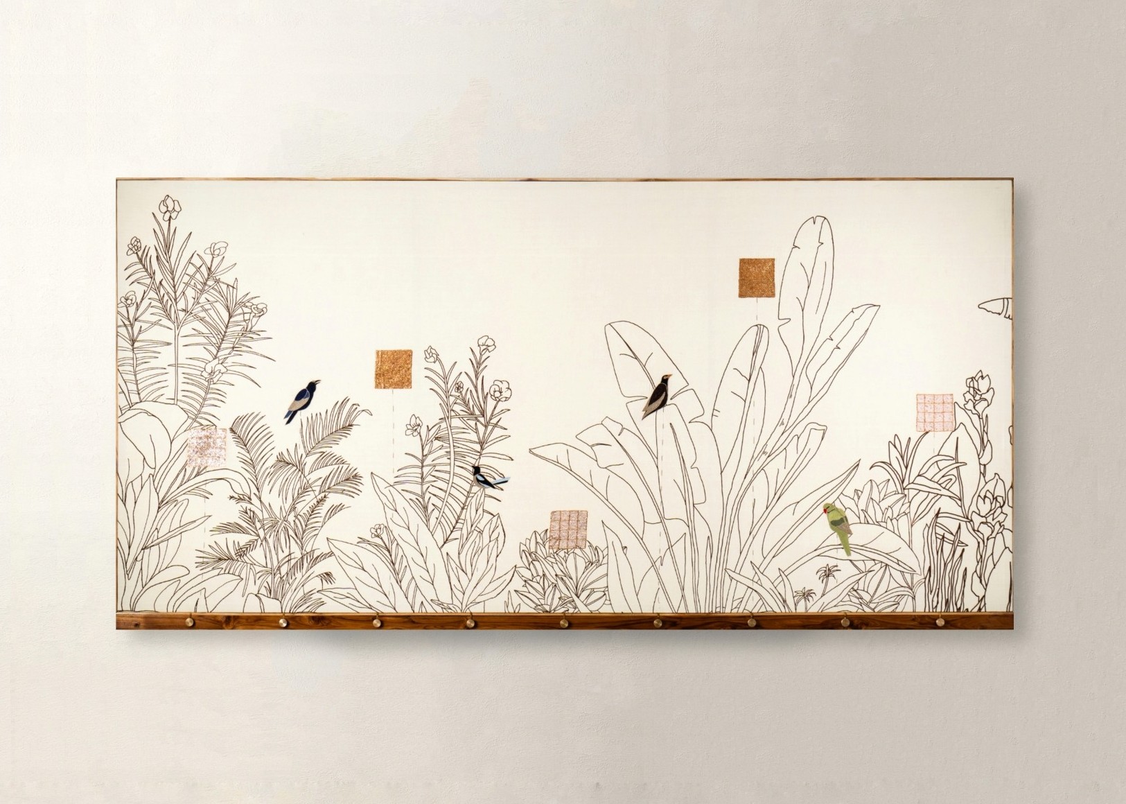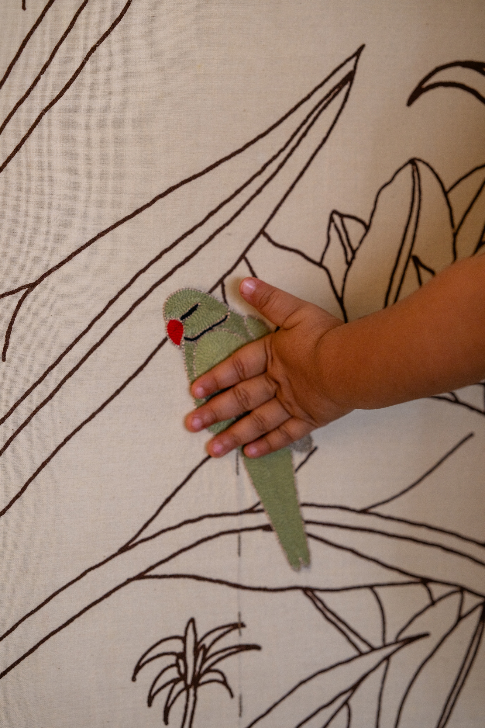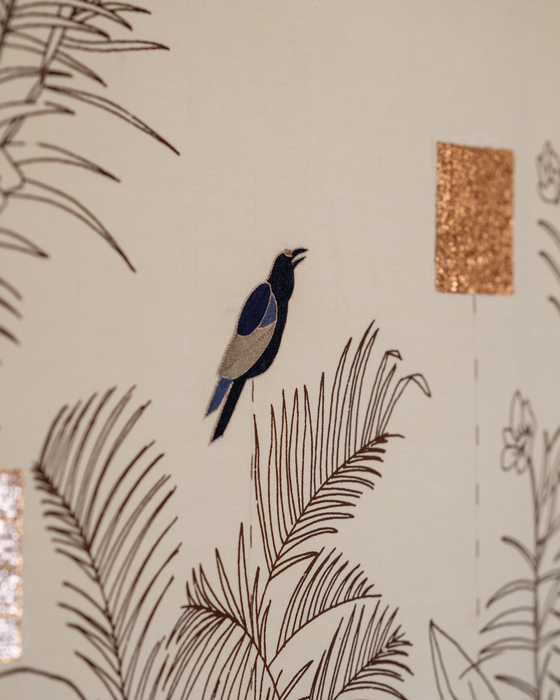 Featuring custom print engineered garden landscape, with hand-embroidered birds and motifs, this piece captures the essence of early mornings — soft light, gentle sounds, and moments of pause. The interaction is designed to reflect that mood: when touched, the birds respond with notes of the sitar, evoking the calm of a morning raga.