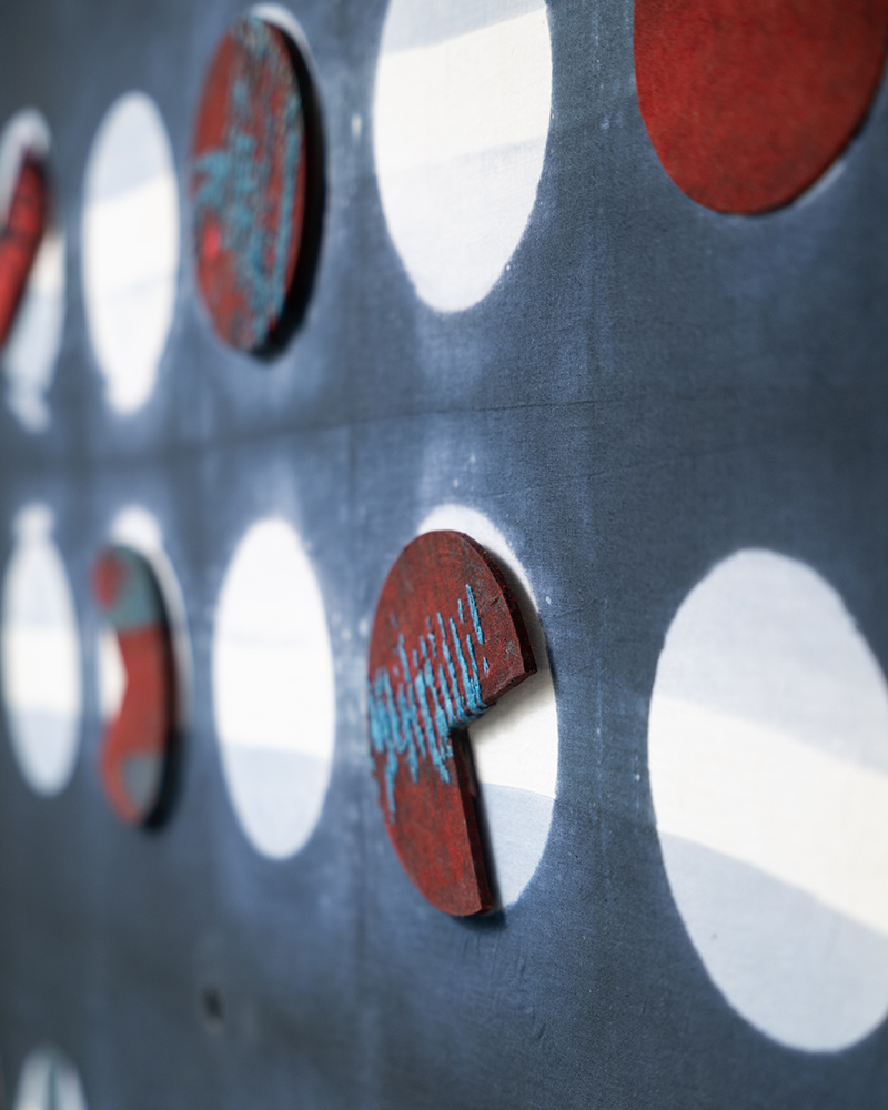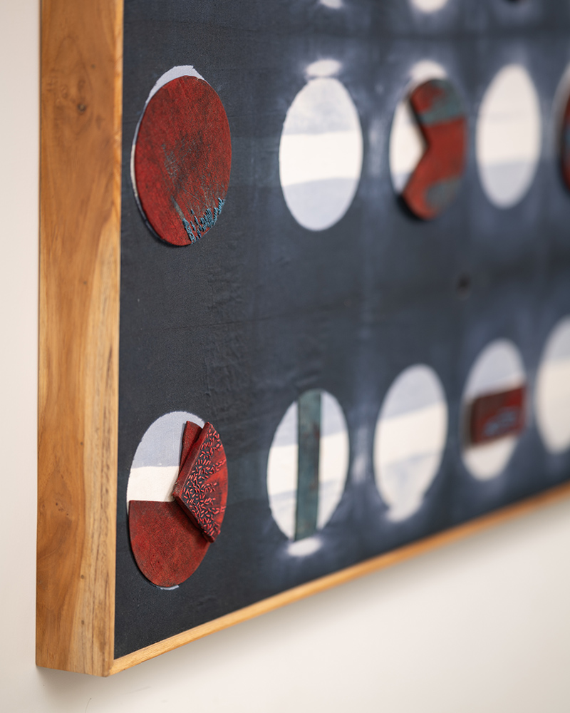 True to its name In Transit is a clamp-dyed motion triggered kinetic, engineered textile art propreitory engineered circuit that gets triggered by motion or proximity and rotates at random speeds and directions. Every interaction with the frame, creates a unique impression on it. This all encompassing frame, including 10 motors and hardware, is easy to install and even easier to use. Comes with a compatible adapter that can be plugged into a power source and the frame is ready to use and interact with.